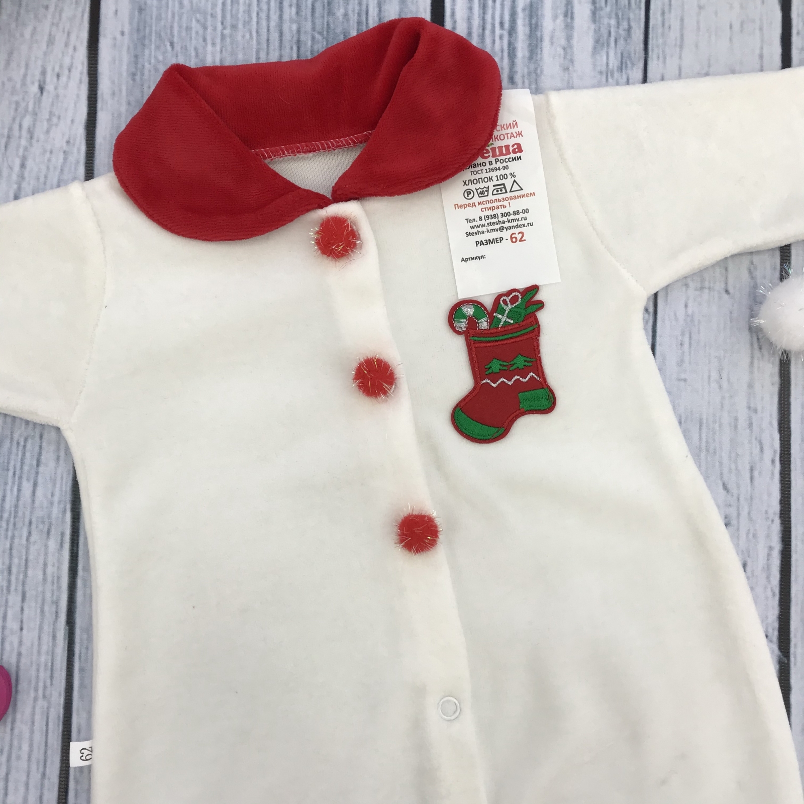 Теги: Купить оптом новогодний комбинезон от производителя. 244. Комбинезон Санта, хлопок 80% велюр 20% ПЭ, молочный 56,62,68 цена,отзывы официальный сайт "Стеша Ухта"